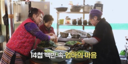 한적한 마을에서 식당을 운영한다는 오경숙 씨를 만난다. 가게 앞에 있는 가마솥들, 연탄난로 등등 할머니 집 같은 이곳. 정겨움에 한번 놀라고 주문하고자 메뉴판을 보면 다시 한번 더 놀란다. 14첩 백반이 6천 원. 국밥도 만 원이 넘어가는 요즘에 어떻게 이 가격이 가능한 걸까? 채소 가게에선 나물을 덤으로 주고, 가게에 오는 이웃들은 채소를 들고 와 주고. 주고받는 이웃의 정 때문에 가능하다는데. 70년 전부터 이 가게를 운영해 왔던 경숙 씨의 어머니 덕분이었다. 좋은 게 있으면 이웃과 나누고 어려운 일이 있으면 도와주었던 어머니. 자연스레 이 식당은 동네 사랑방이 되었다. 25년 전 이 공간을 지키고자 돌아온 경숙 씨는 어머니처럼 나누는 것이 행복해졌단다. 그 따뜻한 마음이 담긴 든든한 14첩 백반에 몸도 마음도 배불러진다.