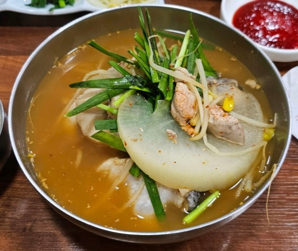 된장 베이스의 진한 국물인 아귀탕도 인기 메뉴예요. 통통한 아귀 살이 푸짐하게 들어가 있고, 국물에 담긴 구수한 풍미가 여행의 피로를 녹여줄 정도입니다. 특히 아귀 간이 국물에 특별한 감칠맛을 더해 한 그릇만으로도 만족스러운 식사가 가능해요.